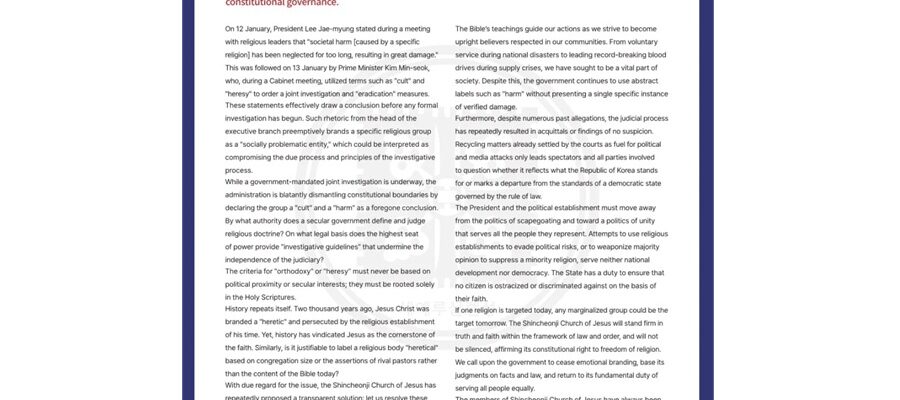 The government has explicitly targeted a specific religious group, categorically labeling it a “social harm” and a “detriment” while mobilizing state power in a retaliatory manner. Such actions constitute a grave violation of Article 20 of the Constitution of the Republic of Korea, which guarantees the freedom of religion and the principle of the separation […]